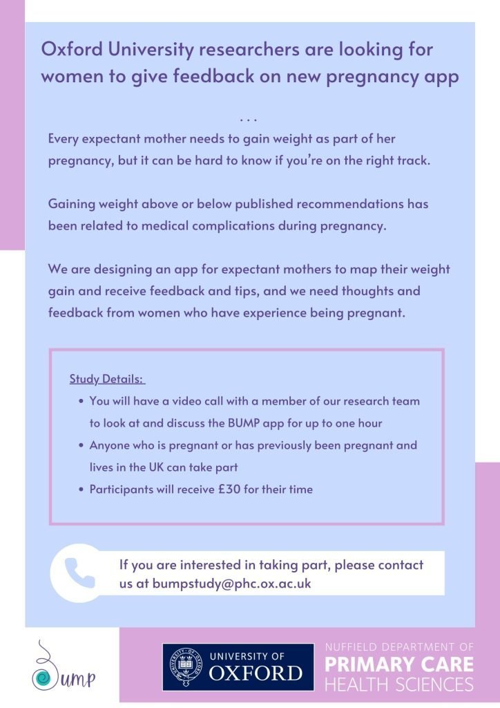 We are looking for women and birthing people with experience being pregnant (either currently or in the past), to provide us with feedback on the BUMP app. This will include having a video call with a member of our research team for up to 1 hour. We will discuss about any experience you might have of weight advice or management during pregnancy, and then we will show you the app and ask about your thoughts on it.