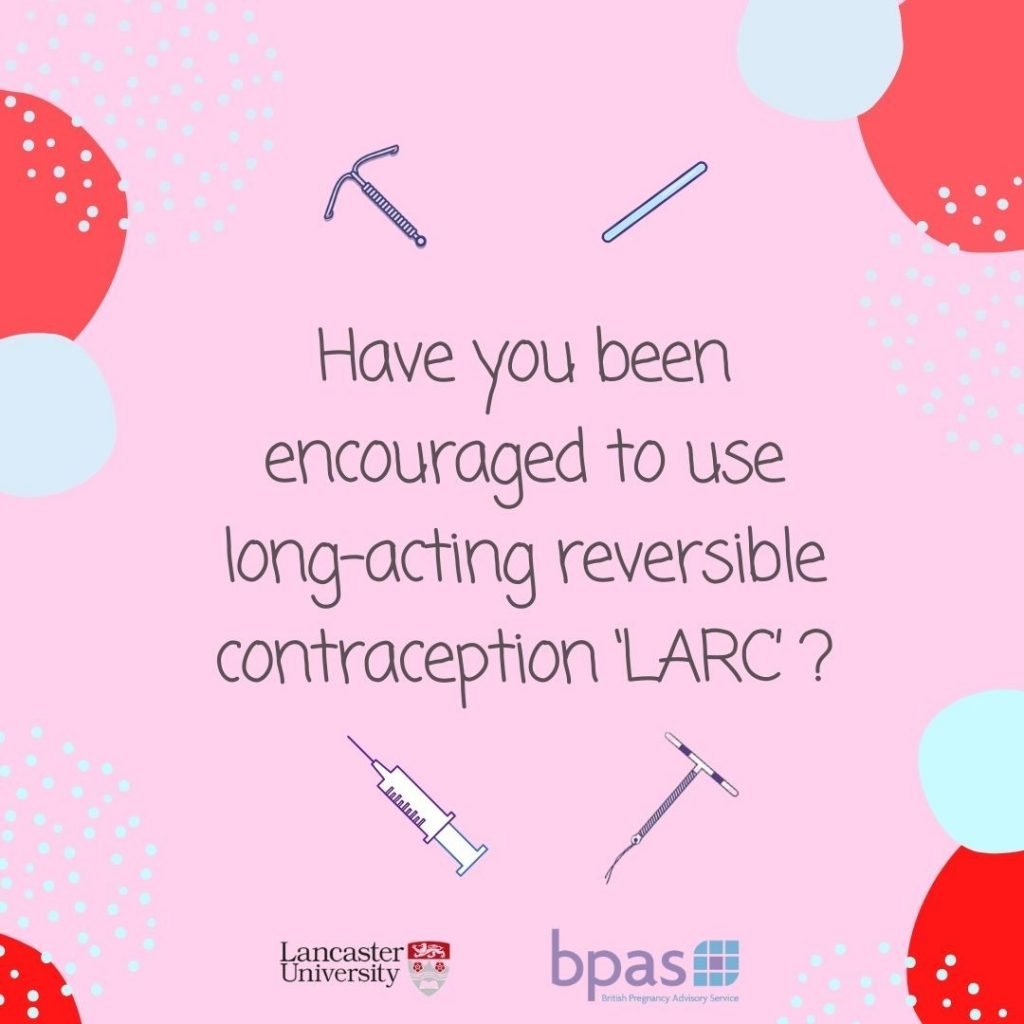 LARC stands for Long Acting Reversible Contraceptives, things like the implant, coil or IUD, injections etc. This is being run by the British Pregnancy Advisory Service (BPAS) in conjunction with Lancaster University.
